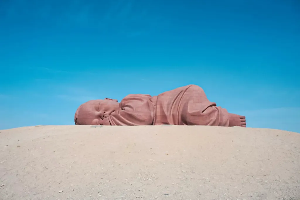 Một điểm check-in đặc biệt thu hút du khách chính là bức tượng em bé ngủ say giữa sa mạc. Tượng được đặt giữa không gian khô cằn, thể hiện hình ảnh một đứa trẻ nằm co ro, gương mặt an yên như đang mơ giữa gió cát khắc nghiệt. Hình ảnh này mang đến sự đối lập đầy thi vị – mềm mại giữa thô ráp, trong trẻo giữa hoang dại – khiến ai cũng muốn dừng lại, chụp hình và suy ngẫm.