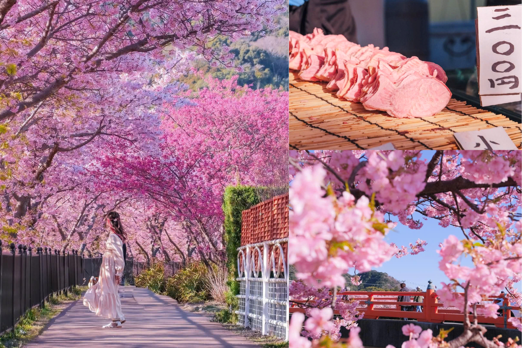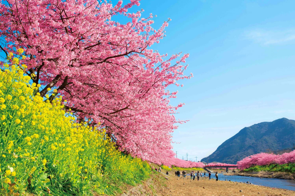Hành trình tour du lịch Nhật Bản mùa xuân đưa du khách đến thị trấn Kawazu (tỉnh Shizuoka), nơi diễn ra Lễ hội Kawazu-zakura Matsuri nổi tiếng. Dọc theo con sông Kawazu dài hơn 4km, hàng nghìn cây anh đào nở rộ, tạo nên bức tranh hồng rực rỡ giữa không gian thanh bình. Khi đêm xuống, những tán hoa được thắp sáng lung linh, soi bóng xuống dòng nước trong, mang lại khung cảnh vừa huyền ảo vừa lãng mạn. Du khách còn có thể thưởng thức các món ăn đường phố như takoyaki, yakisoba hay dâu tươi địa phương – hương vị đặc trưng của mùa xuân Nhật Bản.