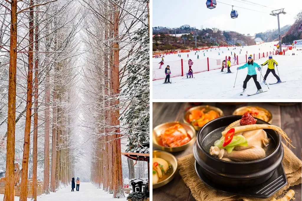 Điểm nhấn: Check-in đảo Nami phủ tuyết trắng, trượt tuyết tại Yongpyong hoặc Vivaldi Park, thưởng thức gà hầm sâm nóng hổi.