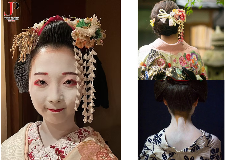 Lớp trang điểm trắng đặc trưng không chỉ để làm đẹp mà còn giúp làm nổi bật biểu cảm khuôn mặt dưới ánh đèn. Mái tóc được tạo kiểu cầu kỳ với các phụ kiện truyền thống gọi là kanzashi.