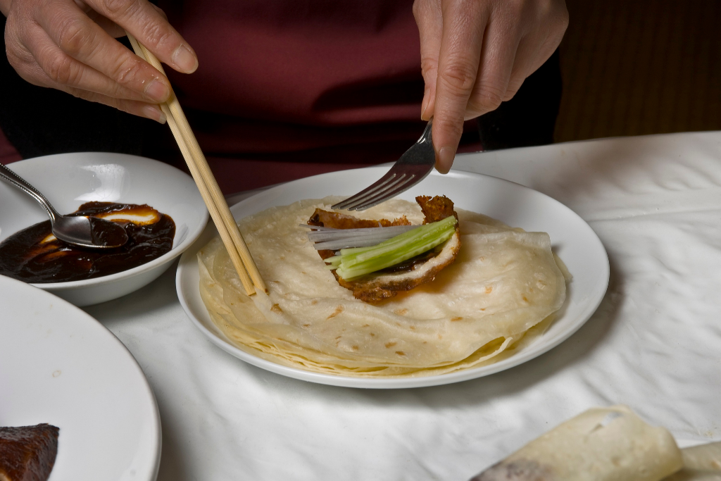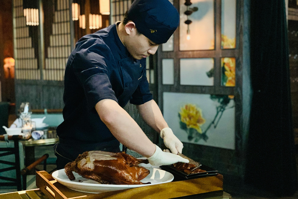 Nếu chỉ nhìn vào hương vị, người ta có thể nghĩ vịt quay Bắc Kinh chỉ đơn giản là thịt vịt nướng giòn. Nhưng giá trị thực sự nằm ở cách thưởng thức. Trong các nhà hàng truyền thống tại Bắc Kinh như Toàn Tụ Đức hay Biện Nghi Phường, đầu bếp sẽ mang nguyên con vịt ra bàn và thực hiện nghi thức cắt thịt trước mặt thực khách.