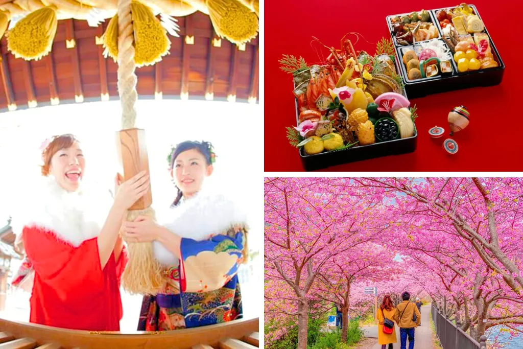 Tour Nhật Bản dịp Tết Nguyên Đán 2026 không chỉ là chuyến du lịch, mà còn là hành trình khám phá phong tục đón năm mới độc đáo. Du khách được thăm đền chùa cầu may, thưởng thức món osechi ryori truyền thống, ngắm hoa Kawazu Sakura – loài hoa anh đào nở sớm nổi tiếng vùng Izu.