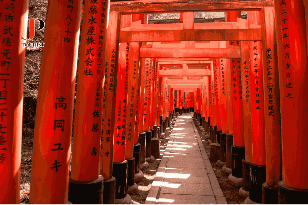 - Điểm dừng chân tiếp theo là Chùa nghìn cột Fushimi Inari. Đây là ngôi đền thờ thần đạo nổi tiếng của Kyoto. Nơi đây nổi bật với hơn 1000 cổng Tori màu đỏ son, những chiếc cổng Tori này liên kết với nhau tạo thành những con đường mòn nằm phía sau khu đền chính. Những con đường này dẫn chúng ta đến với khu rừng rậm của ngọn núi Inari linh thiêng, ngọn núi cao 233 mét nằm trên đất của ngôi đền.